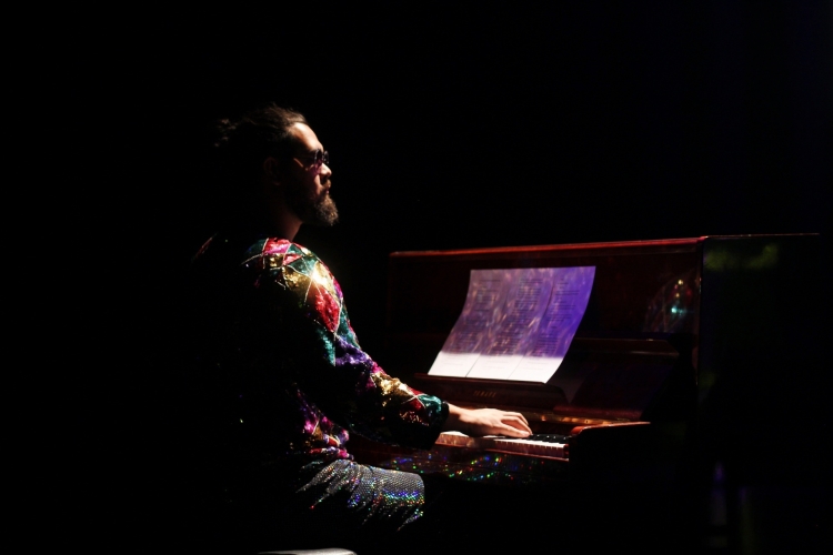 The lighting design (Cody McRae) supports the show to great effect. The keyboard and the main stage space are lit separately by coloured LEDs, which change to delineate separate scenes. The set consists of a red chaise longue on a rostrum, and a keyboard beside the stage. The rostrum becomes the therapy room, and we the audience become the therapist. This is an excellent directorial choice, as it keeps us firmly engaged in the action throughout the piece. Even sitting in the third row back, I feel as if McRae is making eye contact with me directly, and I can’t look away.